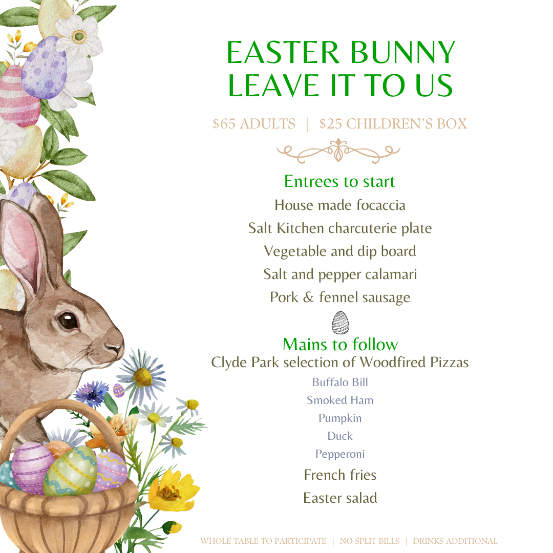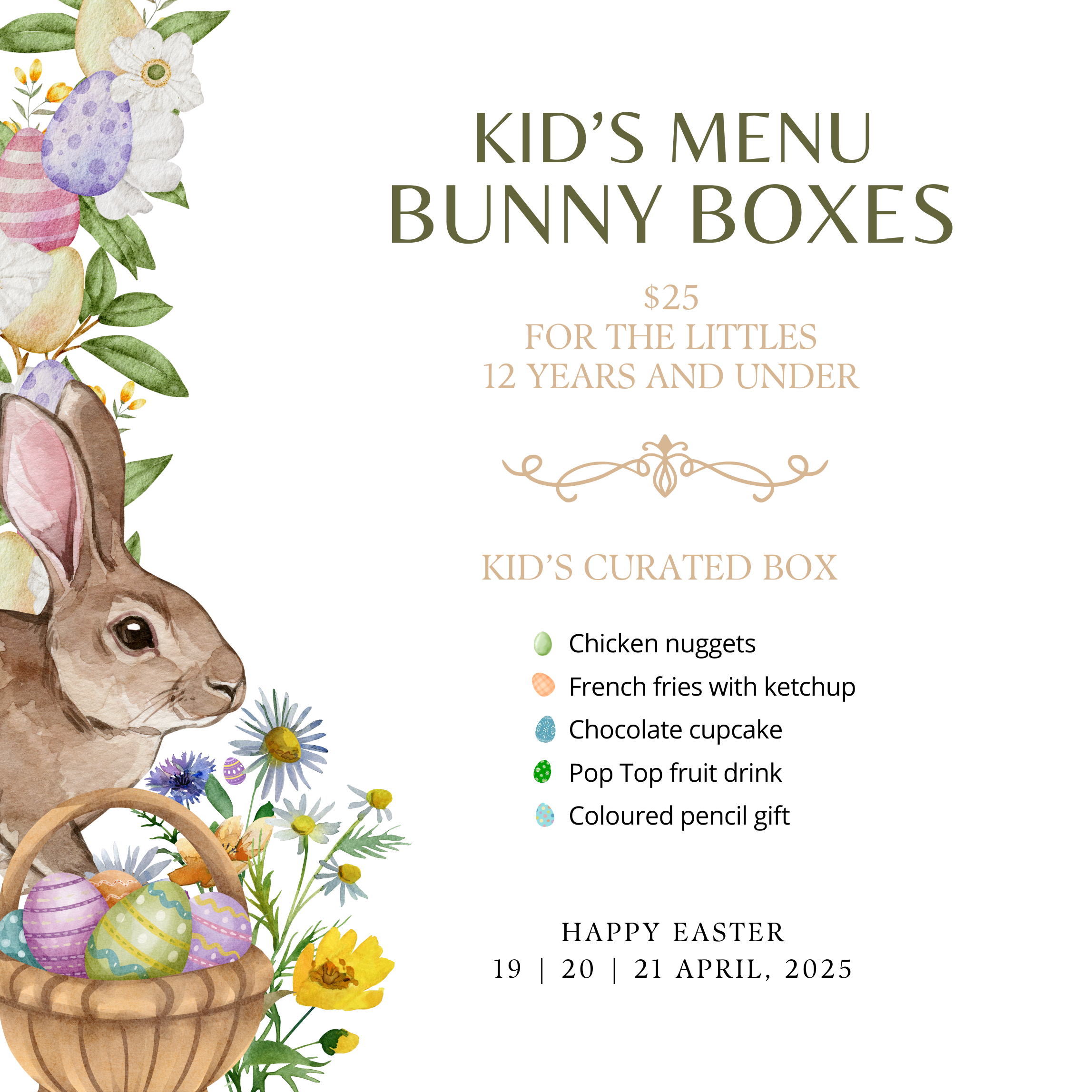 Children are exclusively offered our “Bunny Boxes”, a kid’s meal selection with chicken nuggets, fries, a pop top, a sweet treat and children’s colouring/pencils included. $25 per child.